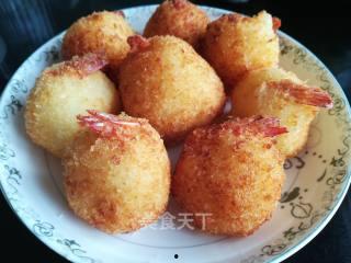 4. 取一小块土豆虾泥,搓成球状,放入热油锅中炸至金黄酥脆。